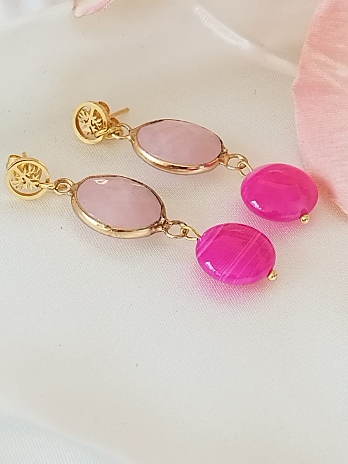 Matière : Perles d’agate rayées naturelles, rondes et plates, fuchsia, taille : env. 14 mm; Pierre naturelle quartz rose forme goutte d’eau ;