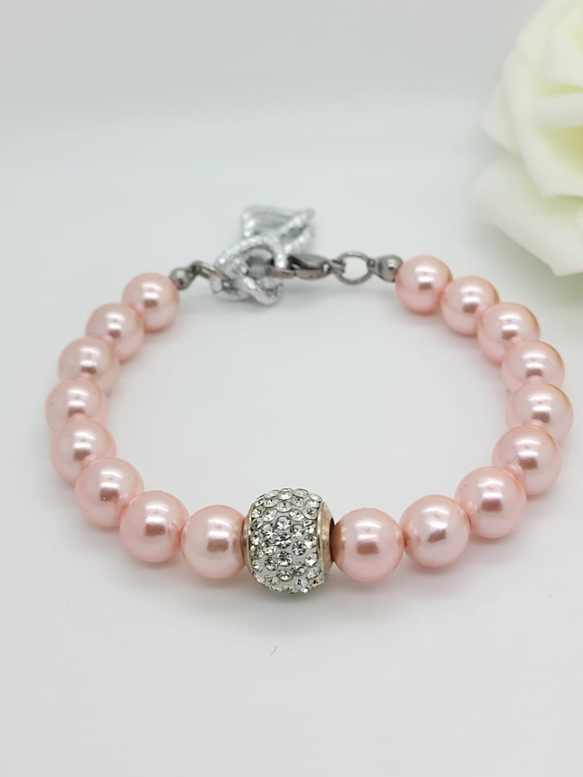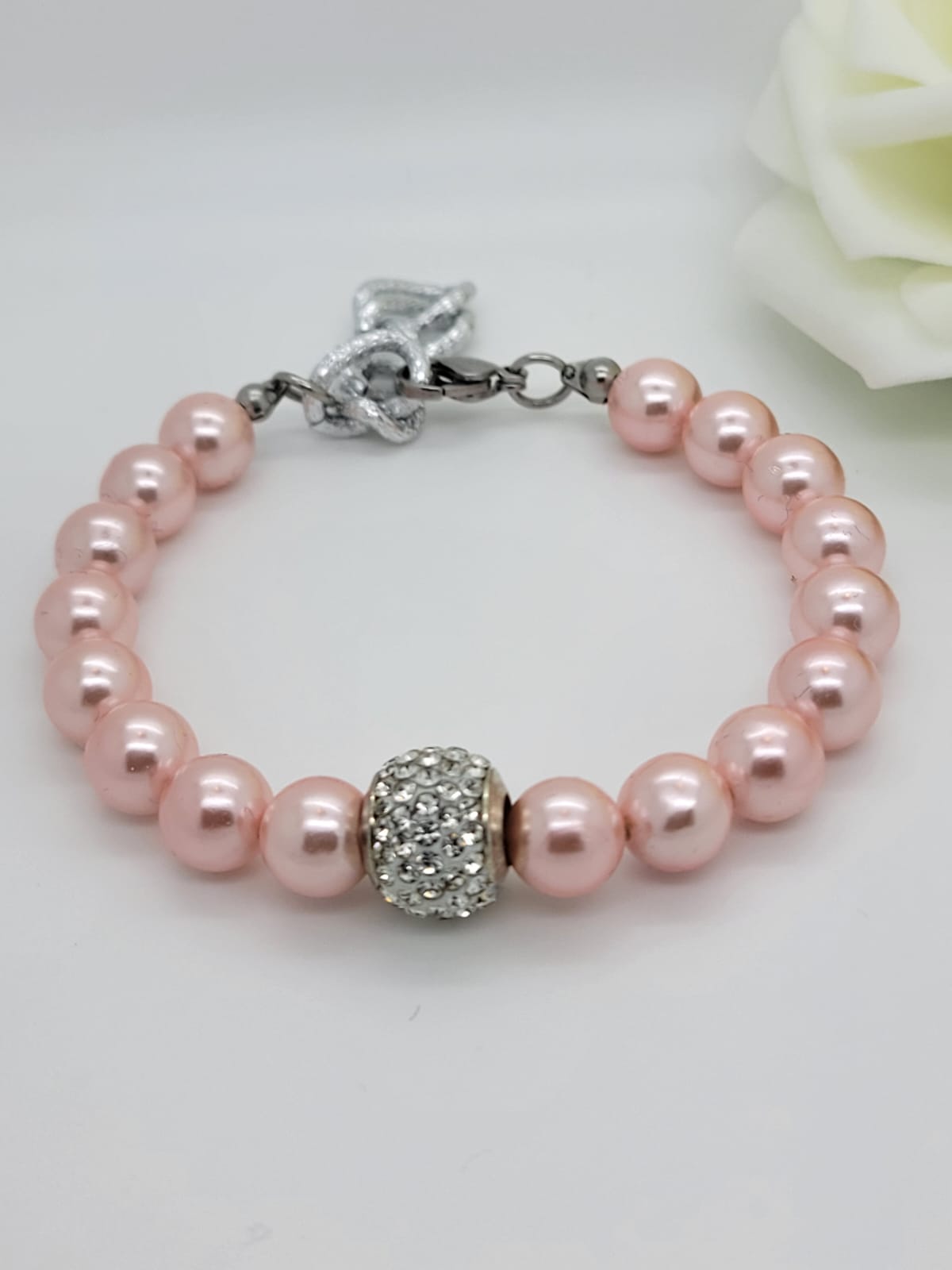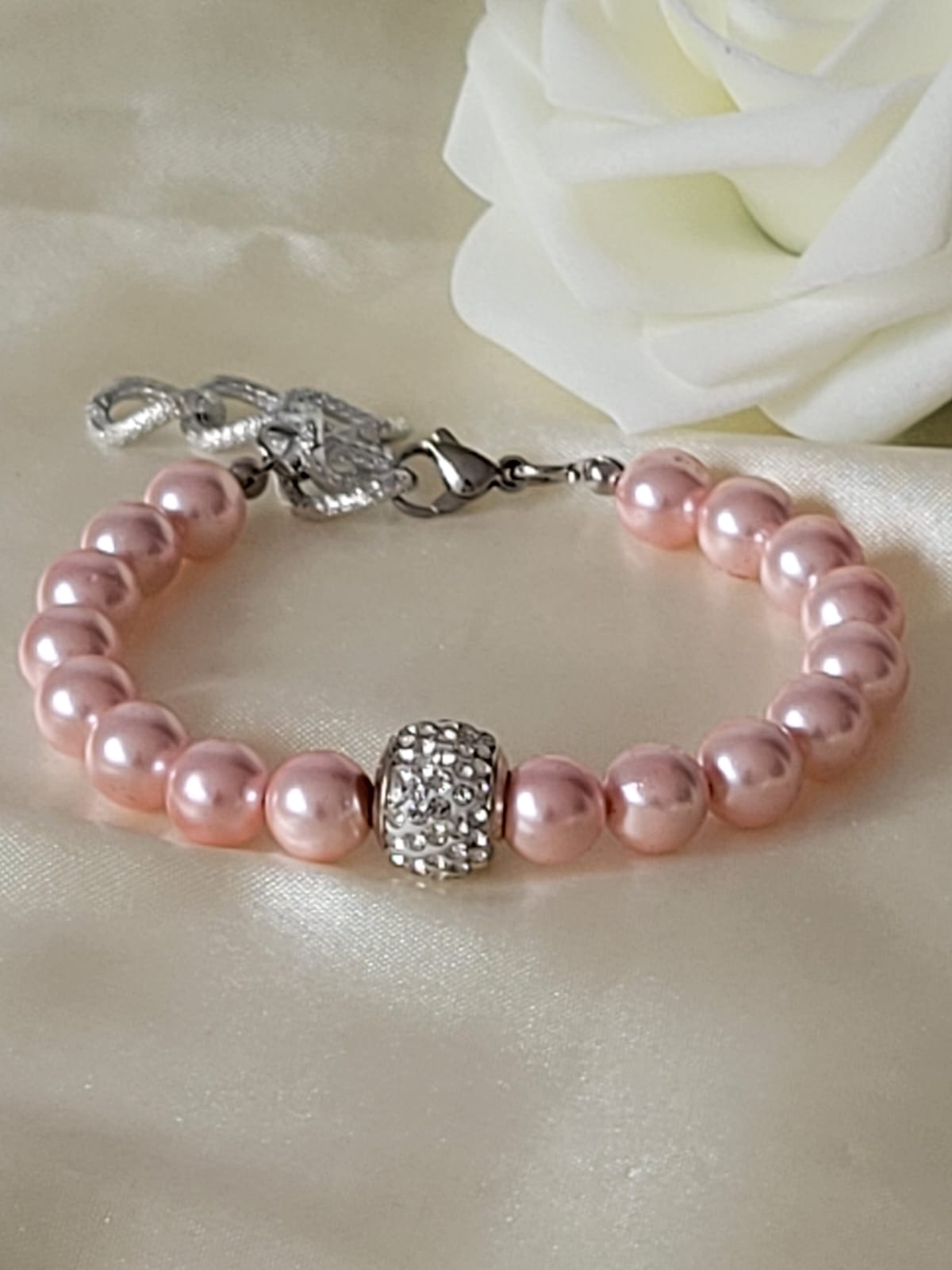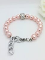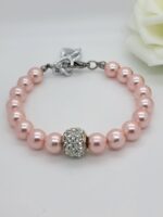 Ce délicat bracelet de mariage est un compagnon élégant pour le plus beau jour de votre vie. Fabriqué à la main avec des perles de nacre rondes roses (8 mm) et une rondelle de zircone scintillante comme point culminant au centre – parfait pour la mariée qui allie chic classique et élégance moderne.