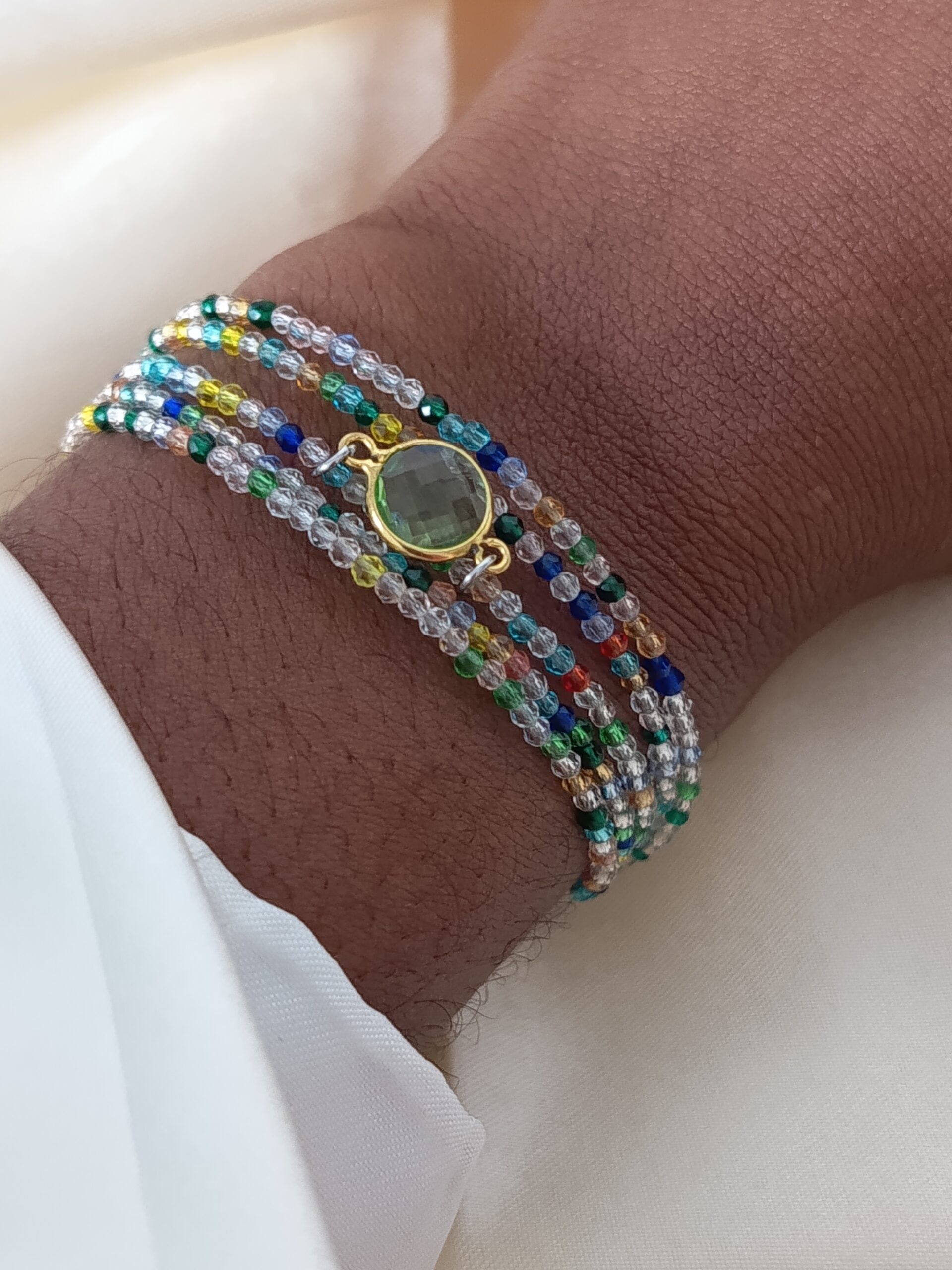 💚 Fin, élégant et coloré : Ce bracelet wrap 4 tours en perles de verre vertes et jaunes associe de fines perles facettées à un connecteur en verre doré placé au centre.