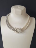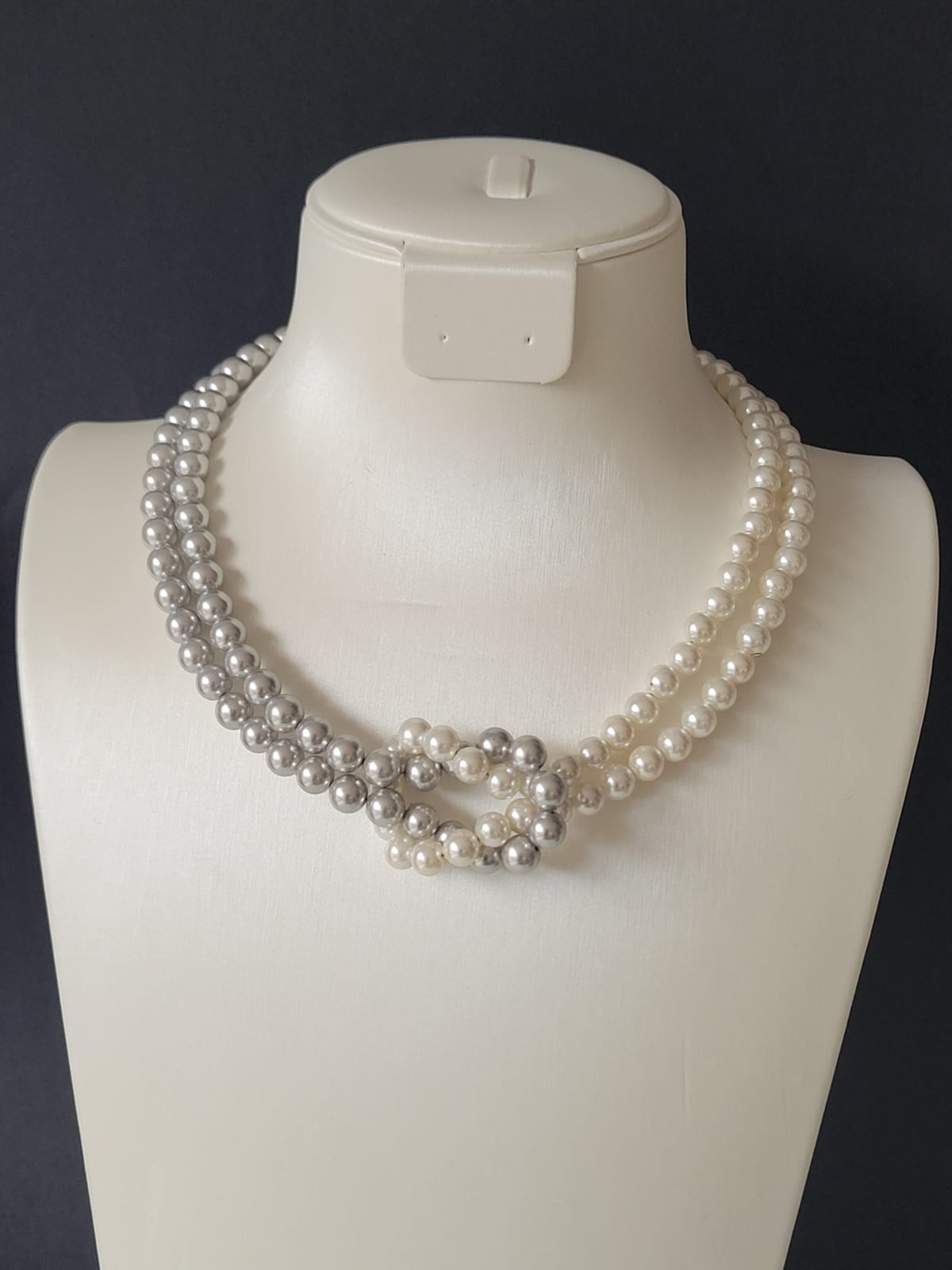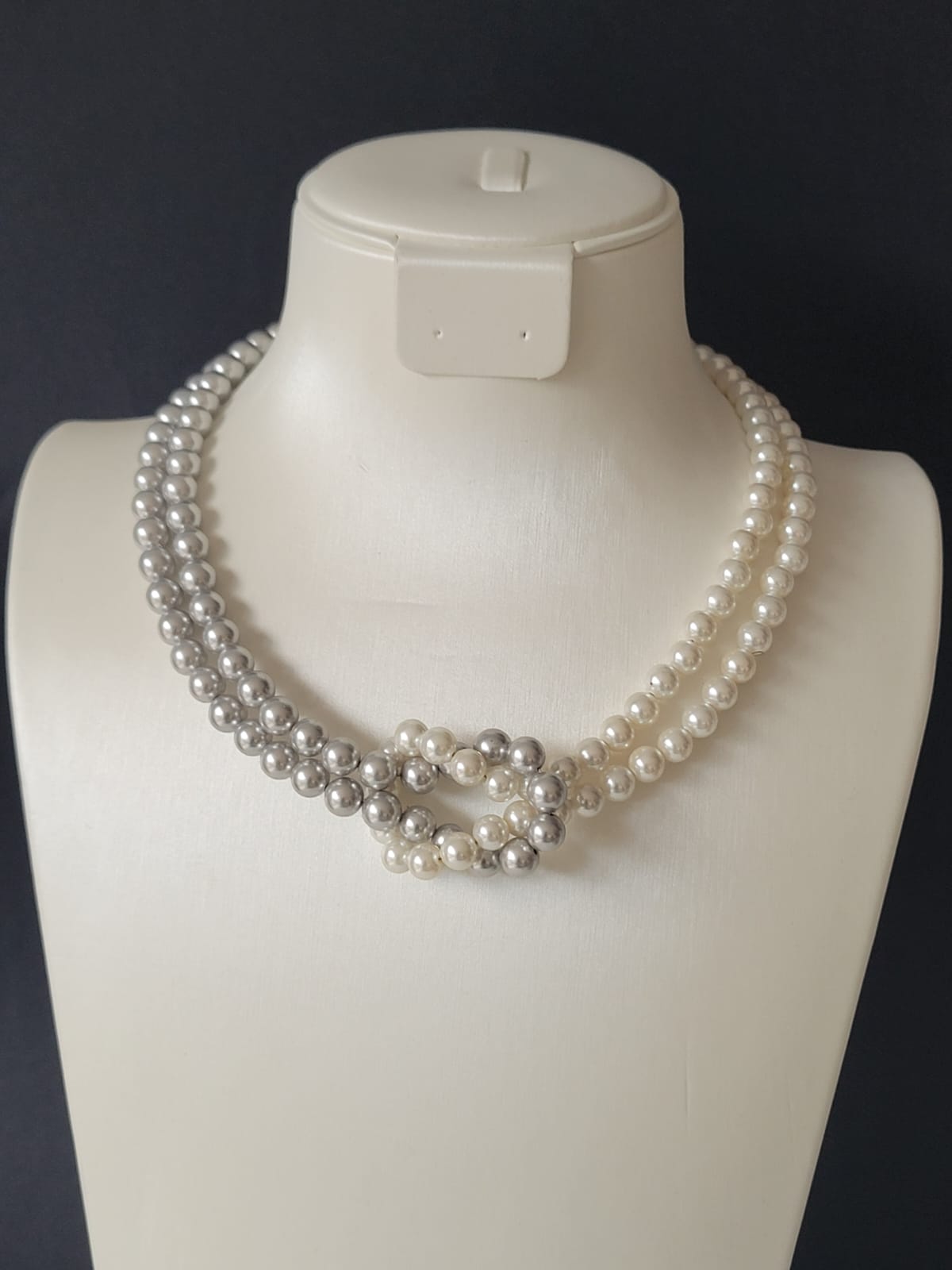 Collier ras du cou à double rangée avec nœud au milieu | Collier de perles coquillage en blanc et gris | Bijoux de mariage | Collier de mariée | Bijoux pour occasions spéciales et bals de fin d’année