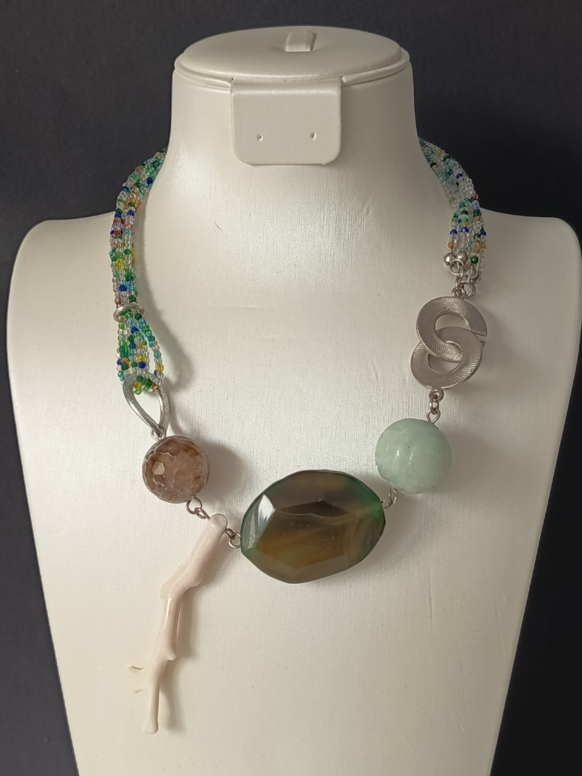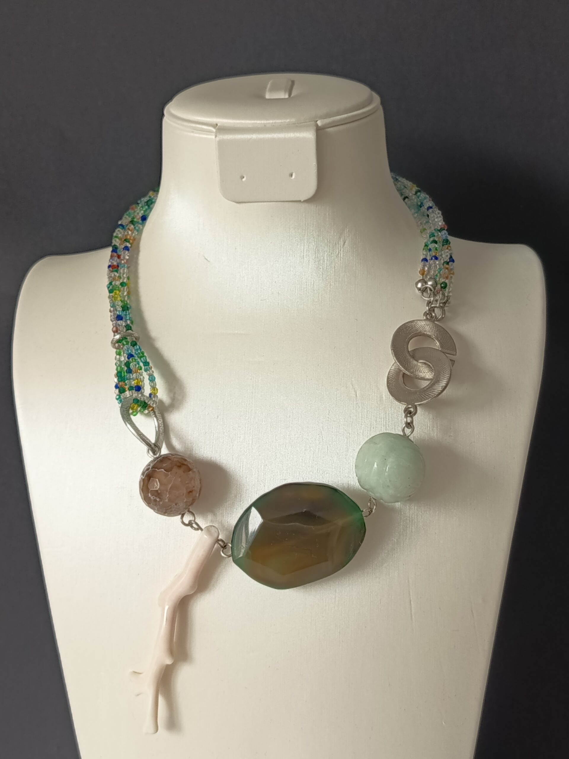 🌸 Collier unique et artisanal, réalisé avec des perles de verre, de la jade, de l’agate et de la corail.