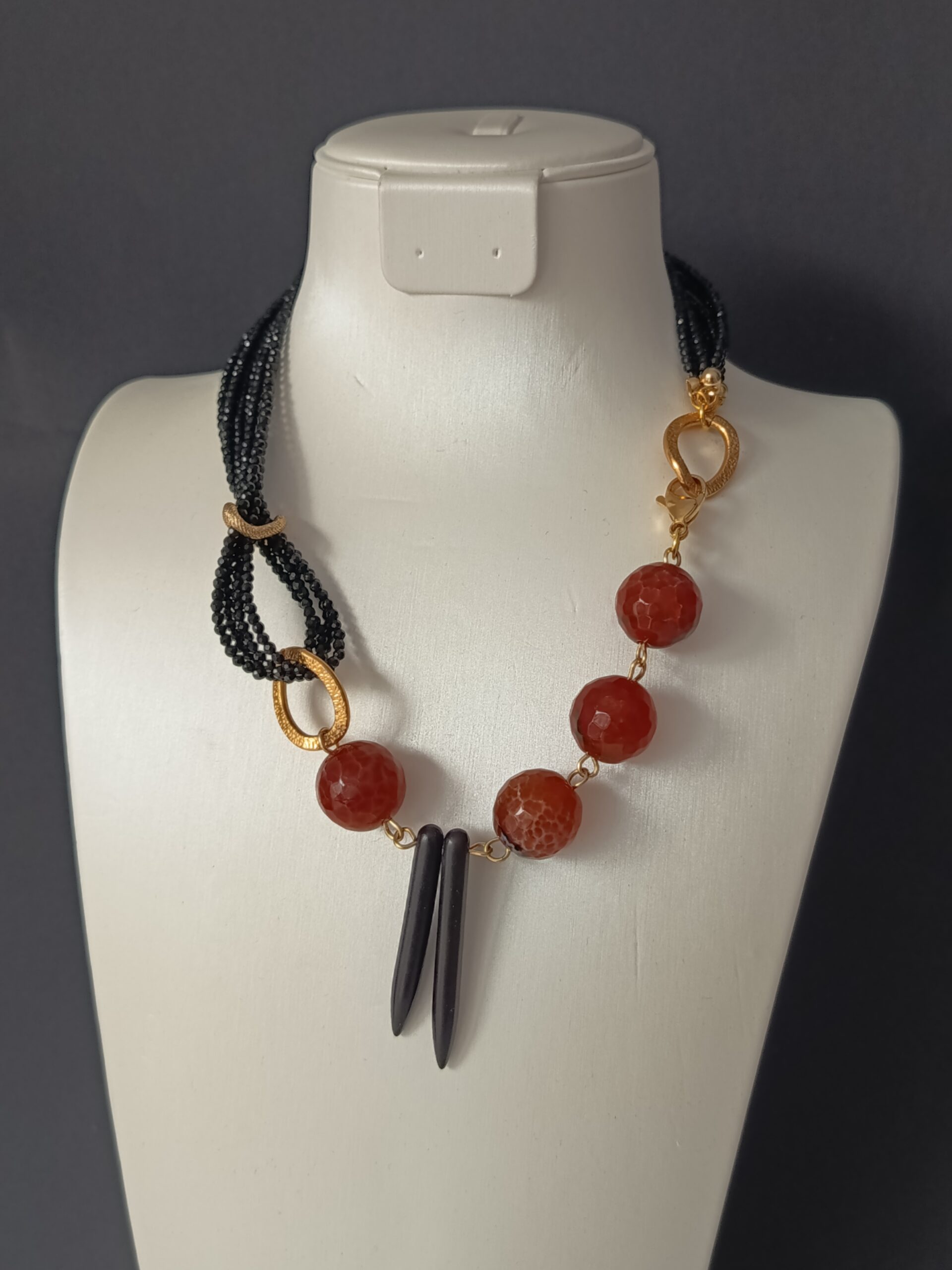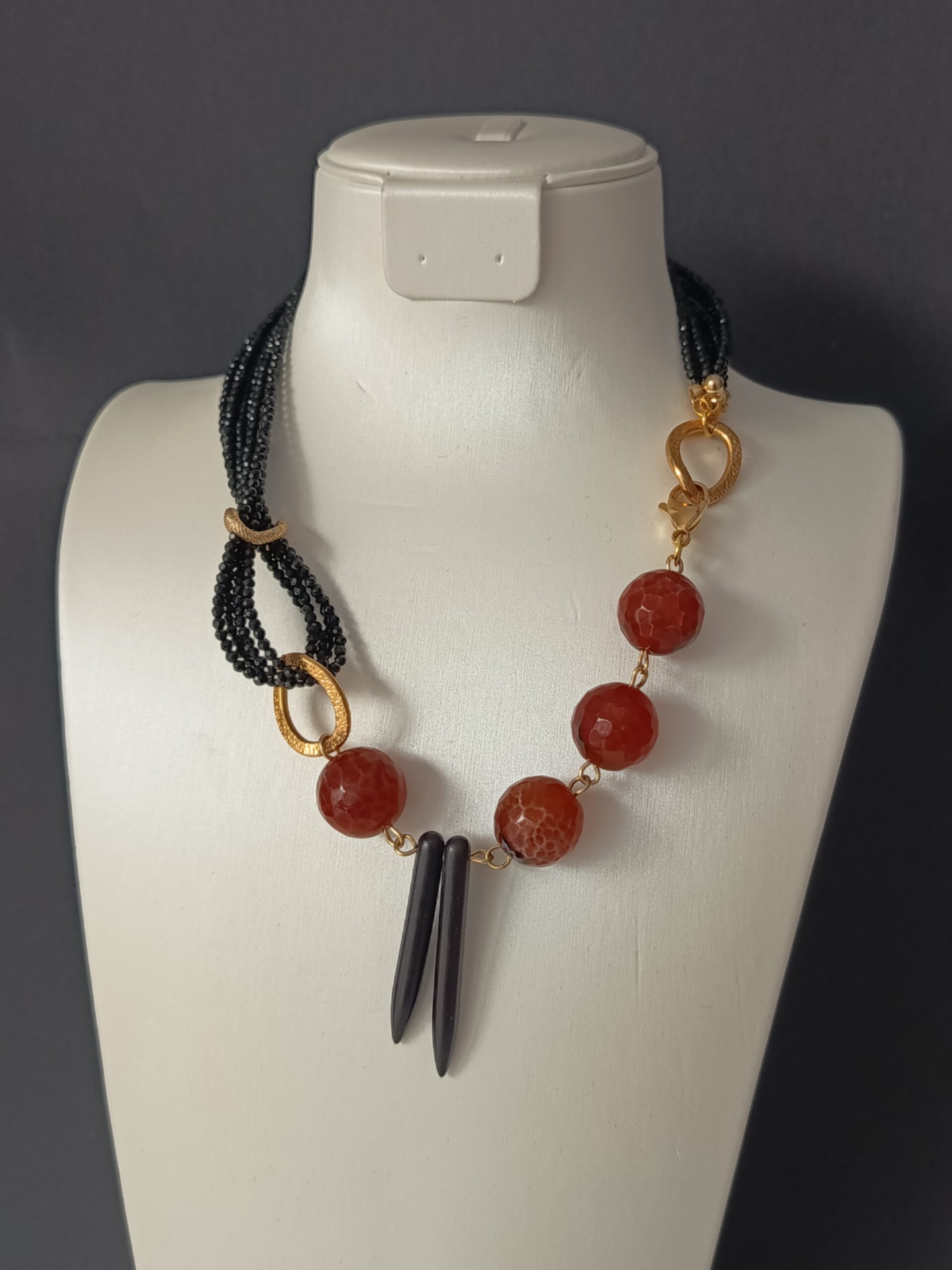 Ce collier expressif réunit 8 rangs de perles de verre facettées en noir et de perles d’agate naturelles facettées (16 mm) en orange foncé. Au centre, un poinçon de howlite noire (howlite teintée & chauffée) apporte une touche audacieuse et marquante.