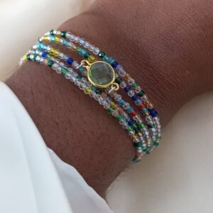 Entre les différentes perles d’agate, des perles de quartz synthétique brunes à facettes sont insérées.