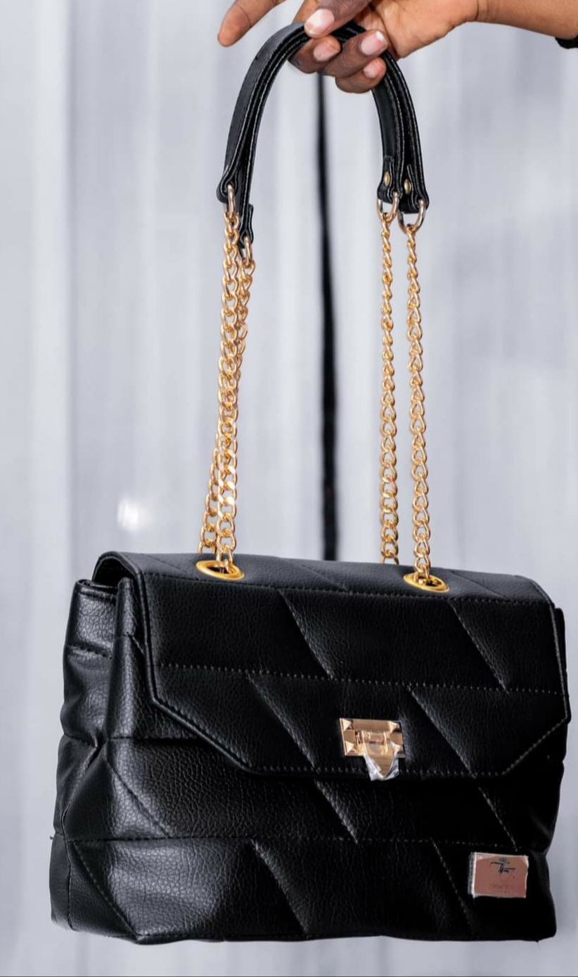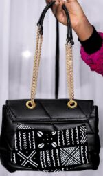 Ce beau sac à main se porte autant en “clutch” qu’à l’épaule grâce à ses chaînettes métalliques dorées.